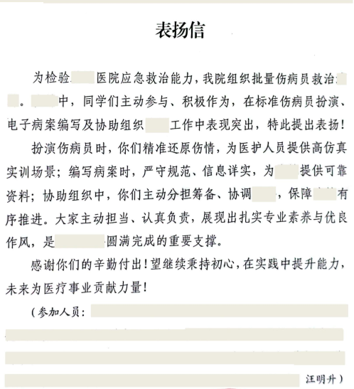 2025年10月,我校卫生管理系2023级卫生信息管理专业学生汪明升在该院实习期间,医院为检验应急救治能力,组织了批量伤病员救治演练,汪明升同学积极主动参与到此次演练中,他精准还原伤病员的生理反应与状态细节,为医护人员搭建了高仿真的实训场景,让应急救治演练的实操价值得到了切实保障;演练过程中他全程投入、认真配合,以严谨的态度助力演练环节高效推进,成为本次演练任务圆满完成的重要支撑之一。他的主动参与以及专业的表现,不仅充分展现了专业素养与责任担当,同时彰显了优秀的协作精神与务实作风。