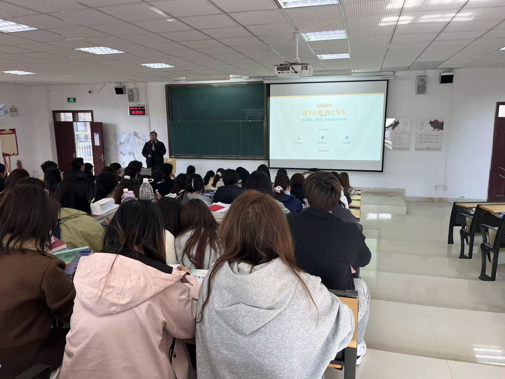 3月12日下午,我系党总支书记郑传清在301教室为各班团干部、学生会及团总支全体成员讲授“开学第一课”,主题为“向下扎根 向上生长——做有温度、有锐度、有高度的学生干部”。