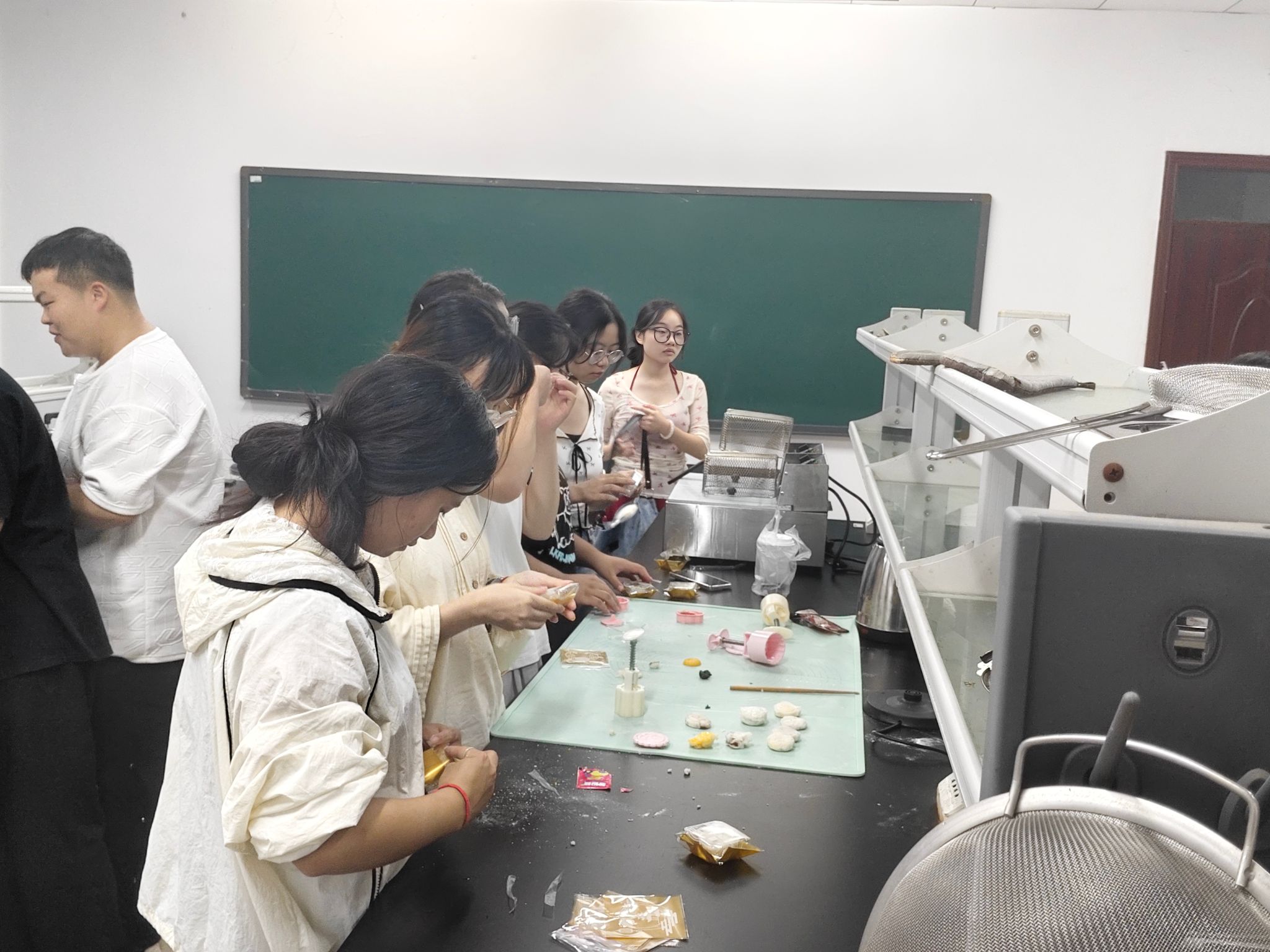 活动现场处处洋溢着浓浓的节日氛围,工作人员提前备好面粉、馅料、模具等食材工具,并邀请有做月饼经验的学生干部现场教学。活动伊始,详细讲解了月饼制作的揉面、擀皮、包馅、压模等步骤,从馅料比例到模具使用技巧,耐心解答师生们的疑问。随后,大家分组协作,纷纷化身“糕点师”,揉面团、放馅料、压花纹,动作从生疏到熟练,欢声笑语不断。有的同学专注地调整馅料分量,力求每一个月饼大小均匀;有的老师与学生默契配合,手把手传授压模技巧,让精致的花纹完美呈现;还有同学发挥创意,在月饼表面印上校徽图案,赋予传统美食独特的校园记忆。